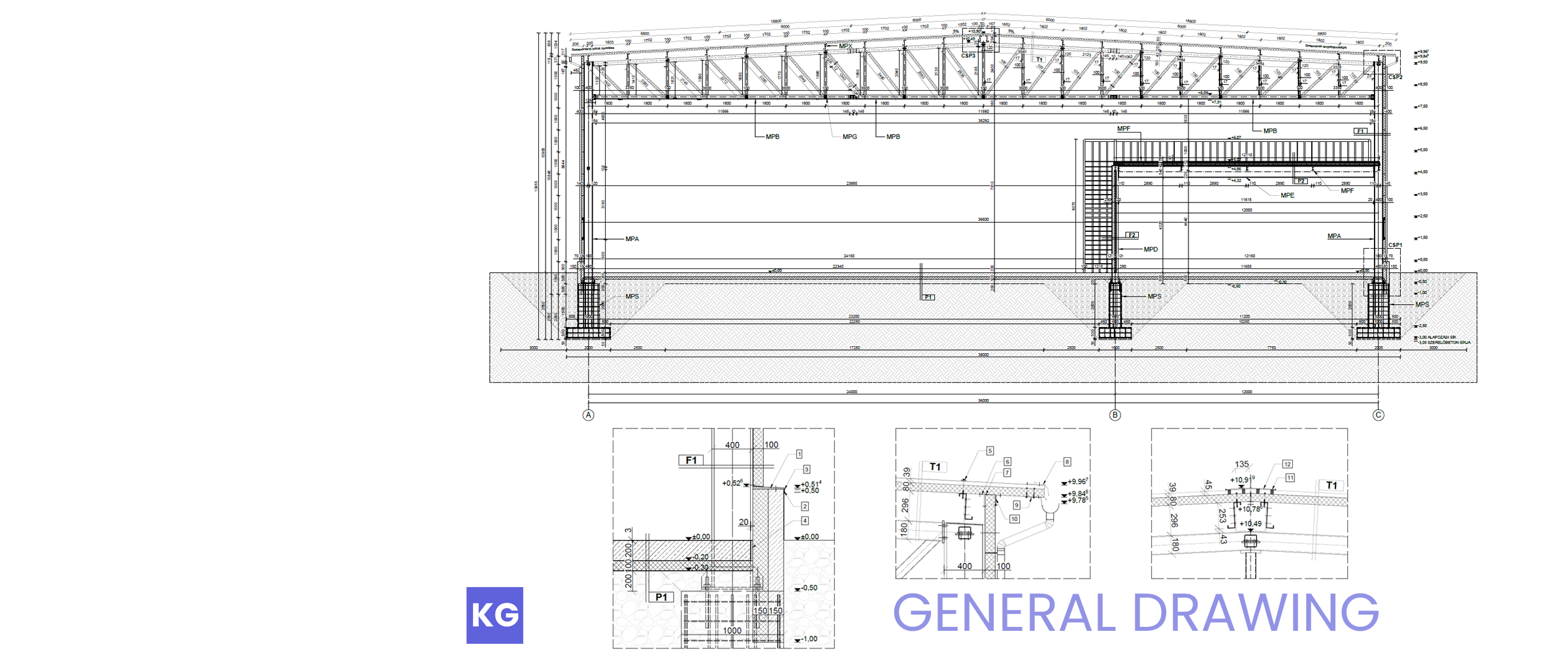 Snit af generel arrangementstegning for den nederste del af stålkonstruktionen.